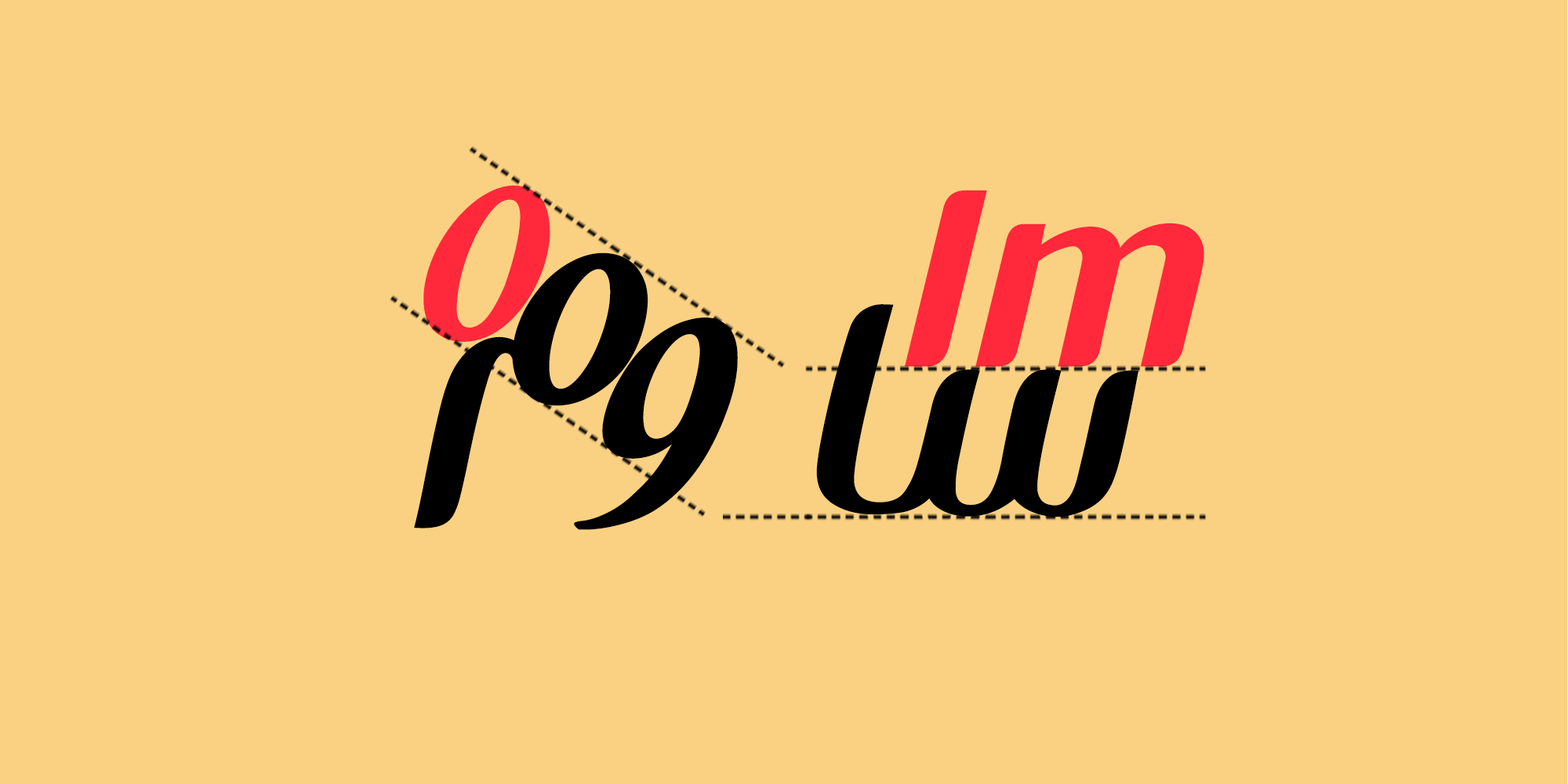 ساختار کلی حروف فرم لمیده (ایتالیک) دارند. قوت و ضعف حروف چشمگیر است وچگونگی شروع قلم به کاراکتر کلی فونت حالتی خوشنویسیگونه اما نه به صورت زاویه قلم مورب بلکه با زاویه قلم افقي داده است.