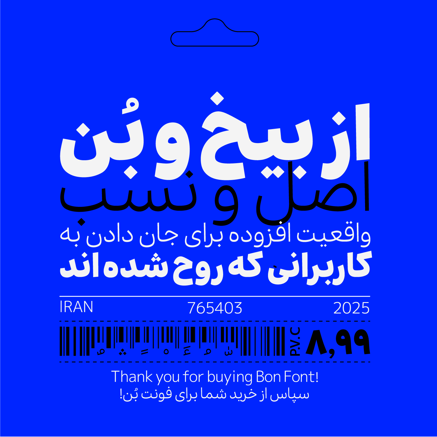 بُن تلاش نمیکند تا خودنمایی کند؛ بلکه محتوا را در اولویت قرار میدهد. این فونت برای همراهی، نه سلطهگری طراحی شده است و تجربهای روان و بدون اختلال در خواندن را فراهم میکند. حضور آن در جعبه ابزار یک طراح نهتنها مفید، بلکه ضروری است و امکان استفاده در فضاهای متنوع چاپی و دیجیتال را فراهم میکند