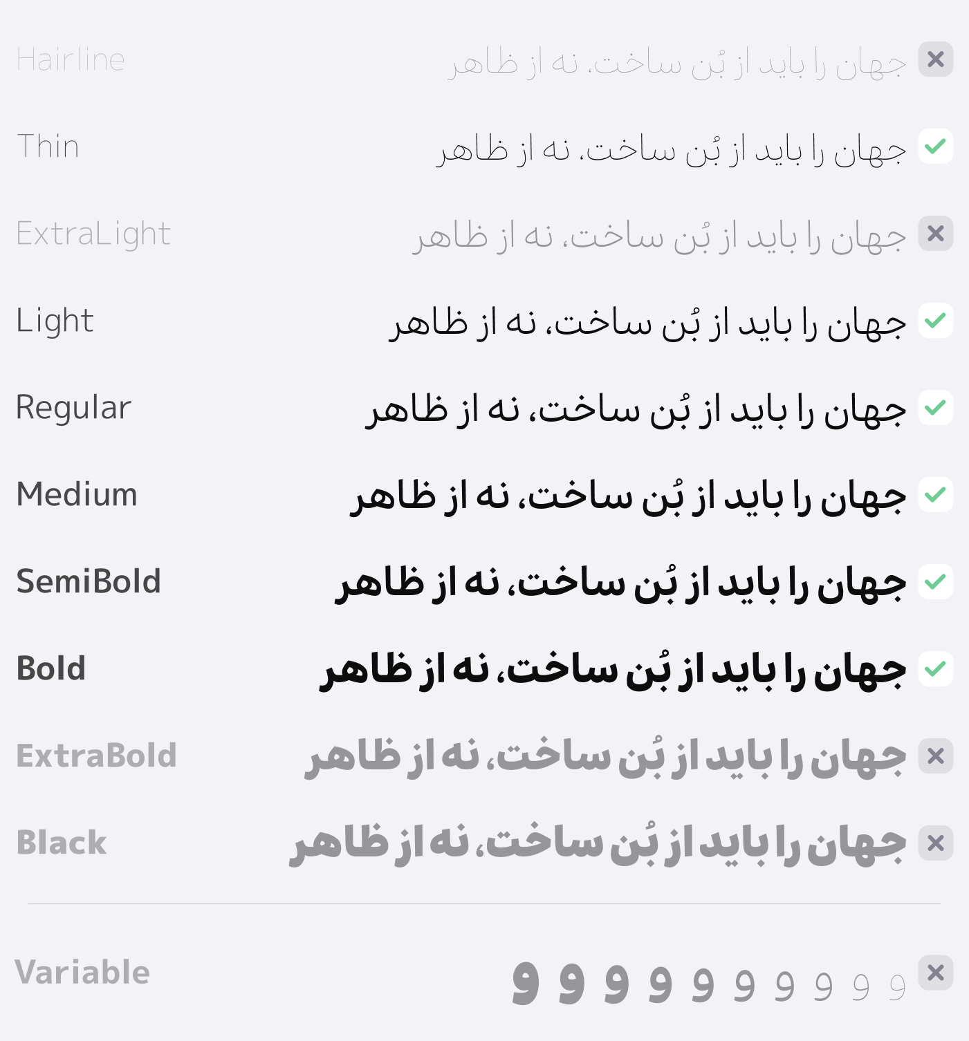 - فونت بدون انگلیسی: فونتهاییکه فاقد حروف و اعداد انگلیسی هستند. (مناسب برای ترکیب با فونت انگلیسی دلخواه در طراحی وب)