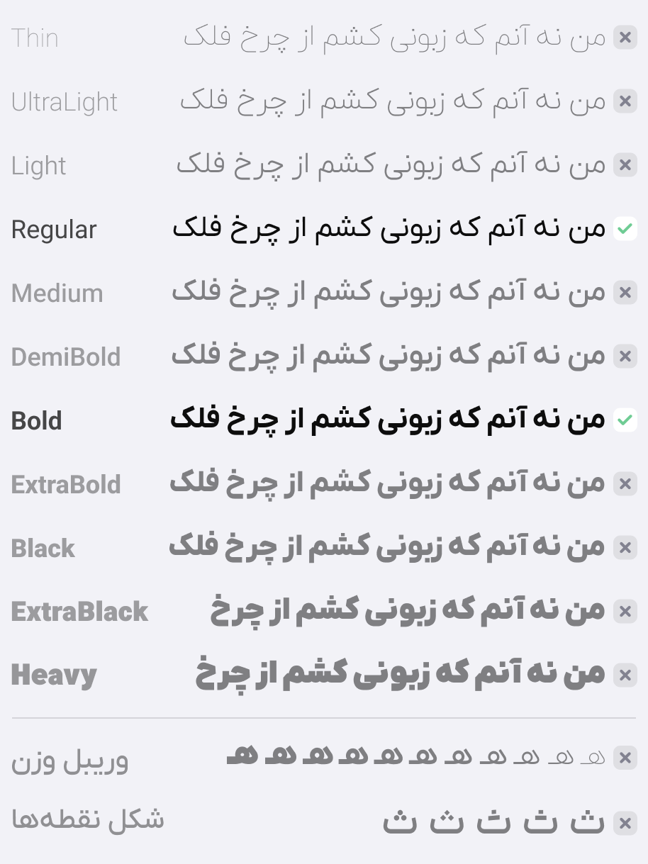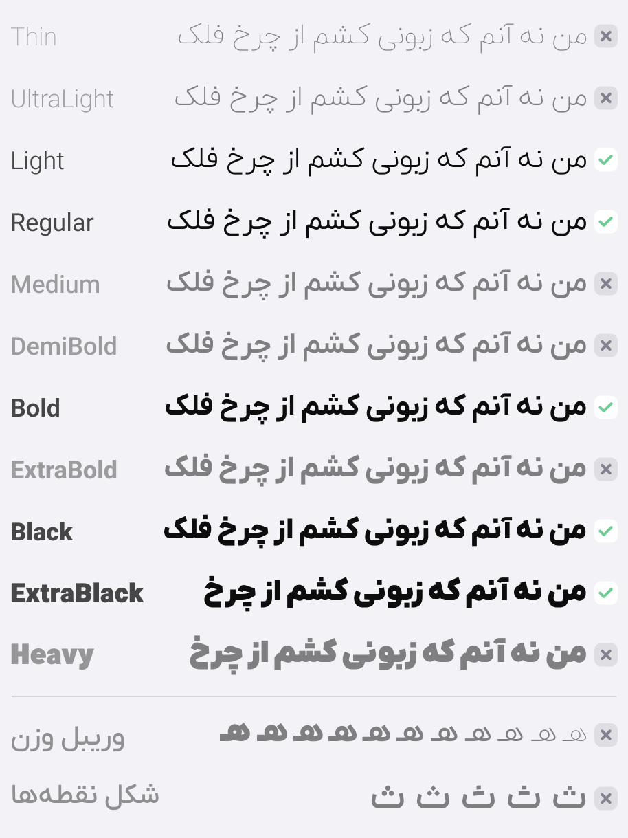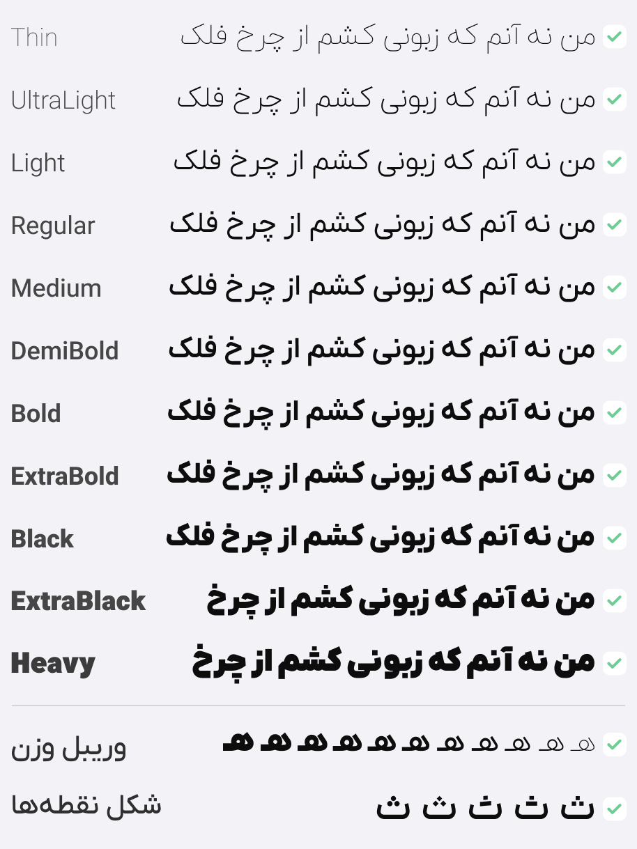 - فونتهای اصلی: با فرمت ttf در ۱۱ وزن.